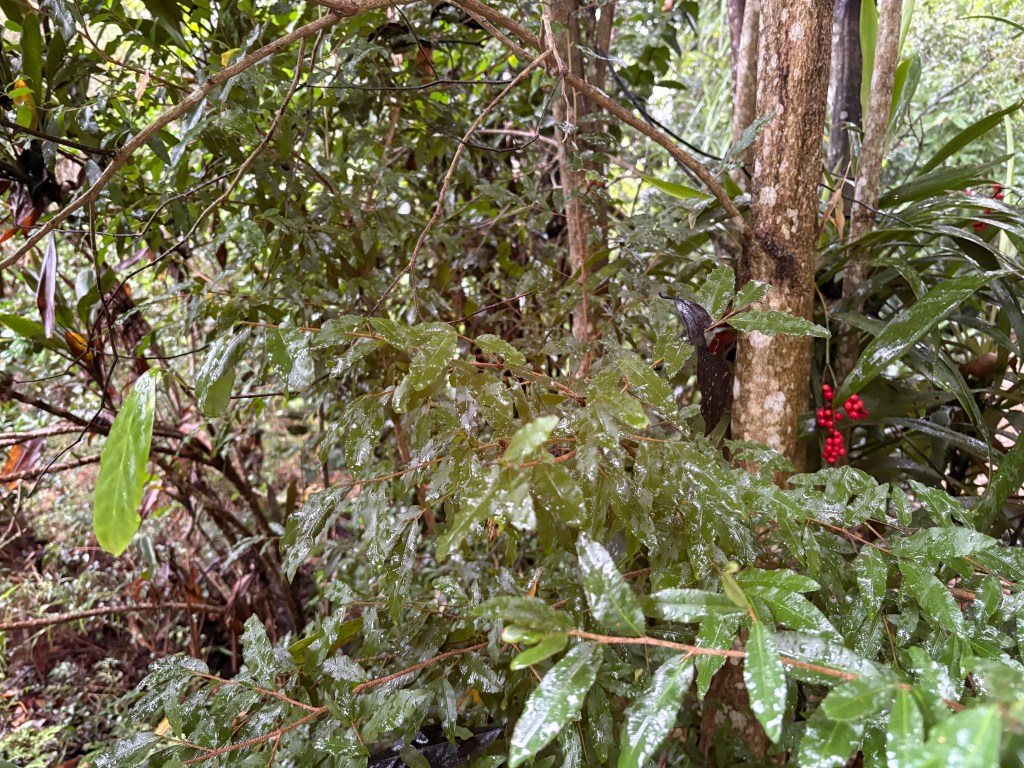 Mist – tiny droplets of water that swirls through the forest – is a vital moisturizer even when there is no actual precipitation. Drip tip leaves capture the mist on their shiny laminae (leaf blades) and, as with rainfall, send it groundwards. In fact the function of drip tips in misty conditions may be even more important than in downpours where rain can actually penetrate the canopy and reach the ground without specialized assistance. This “drip tip”theory of evolutionary adaption to circumstancircumstance was, at least, the prevailing one when I first began studying rainforest ecology forty years ago. I believe it is still valid.
