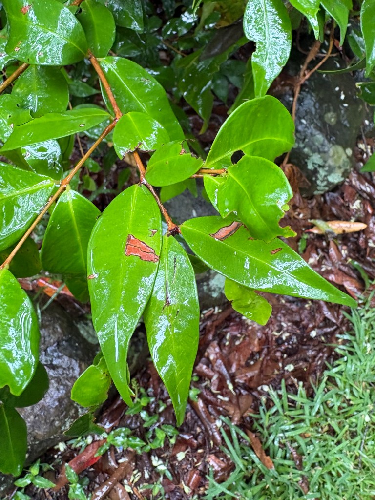Syzygium australe has a modest but still sharp-pointed drip tip. Weight of rain will cause the leaves to point downwards, shedding the water load.
