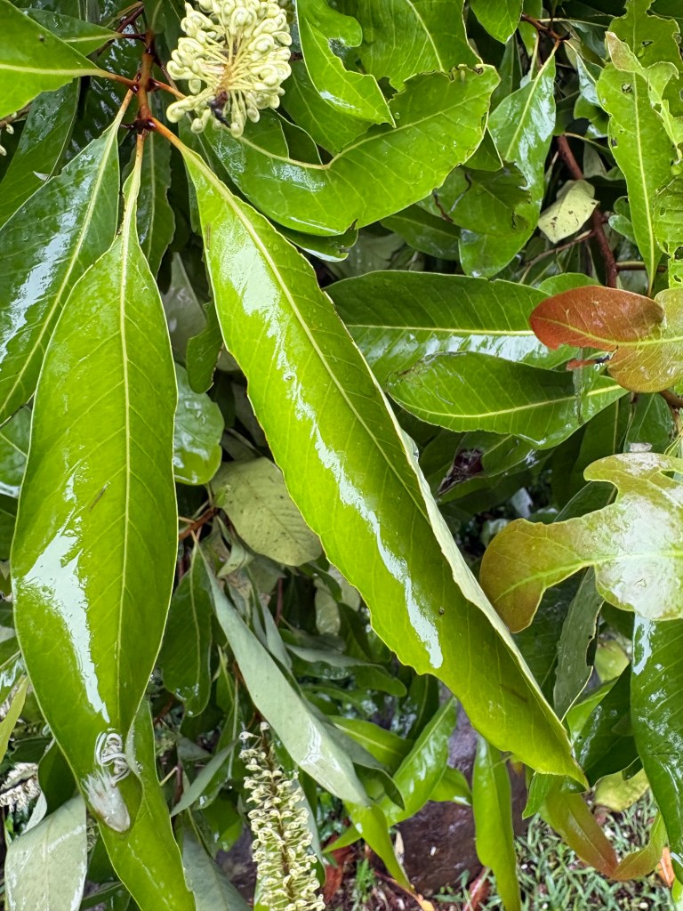 Left: The long, pointed tips of Syzygium leuhmanni, Right: The medium-length tips of Syzygium smithii and, in the middle, a very different tree, the long leaves of the lovely Golden Penda (Xanthostemon chrysanthus) with down-sloping pointed leaves that channel rain very effectively.