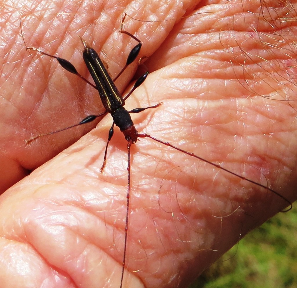 And while I was sitting watching the blossoms fall through shafts of sunlight on this beautiful day I saw on a nearby leaf an elegant little longicorn beetle – there are many of these in the word but this is one of our locals. Just look at those antennae!