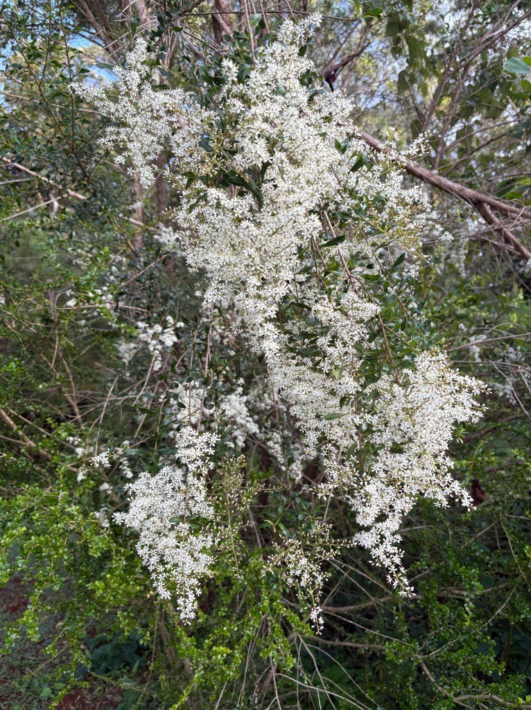The most flamboyantly flowering tree right now is Elaeocarpus grandis, or Blue Quandong, its creamy, fringed blossoms carpeting the forest floor in places. This is a huge tree with branches that extend several metres at maturity so it scatters its flowers over a wide area, promising lots of rich blue fruits to come.