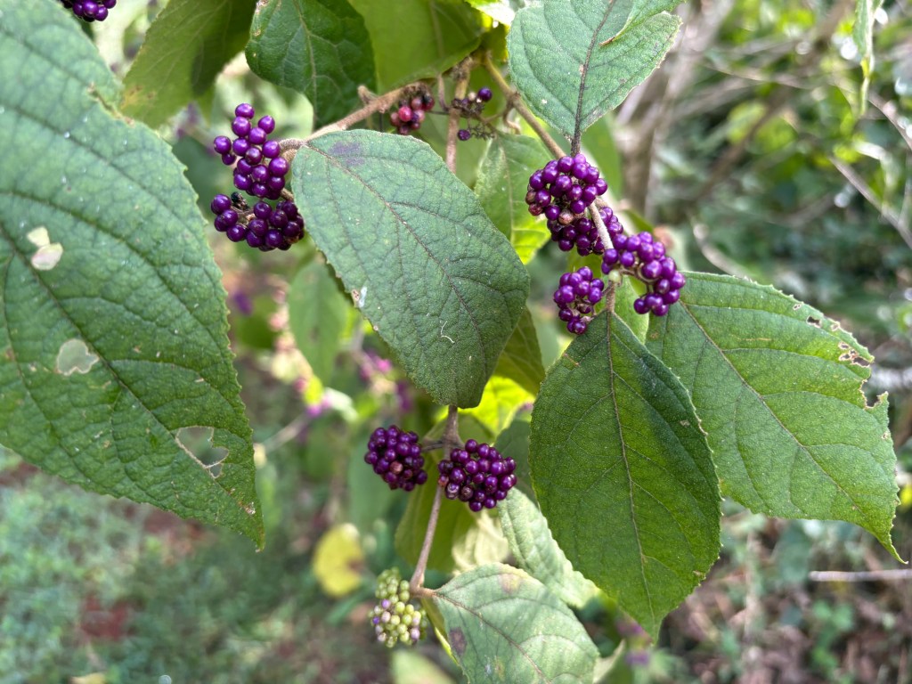 When flowers are not plentiful, berries are there to brighten up the greenery. Cordylines are still dangling their stems of shiny red fruit and my eye was also drawn to the clusters of glowing purple berries of Callicarpa pedunculata. This rather straggly shrub with its modest flowers only comes into its moment of glory at this time of year. As with the tea tree, it grows at the rainforest edge.
