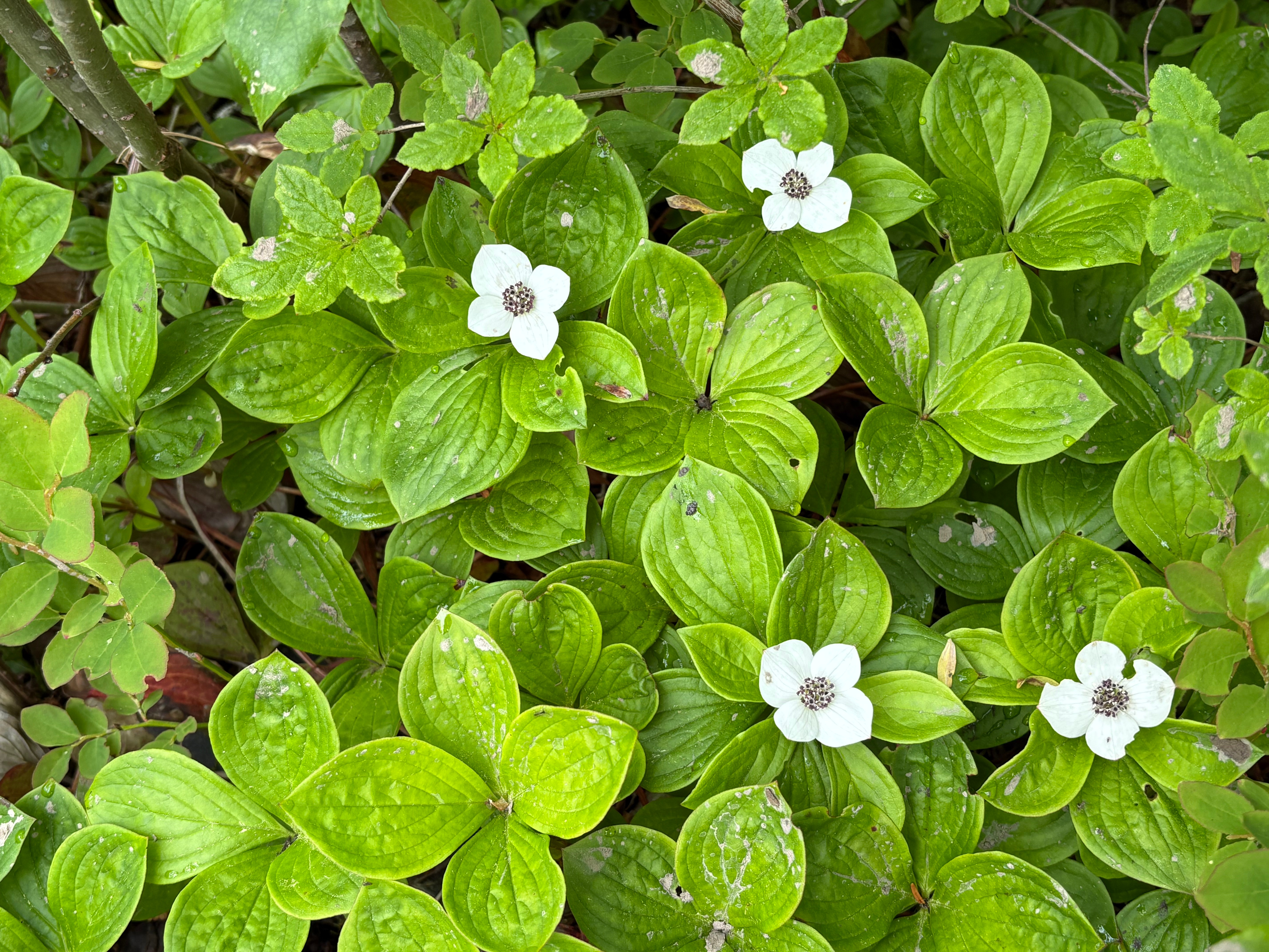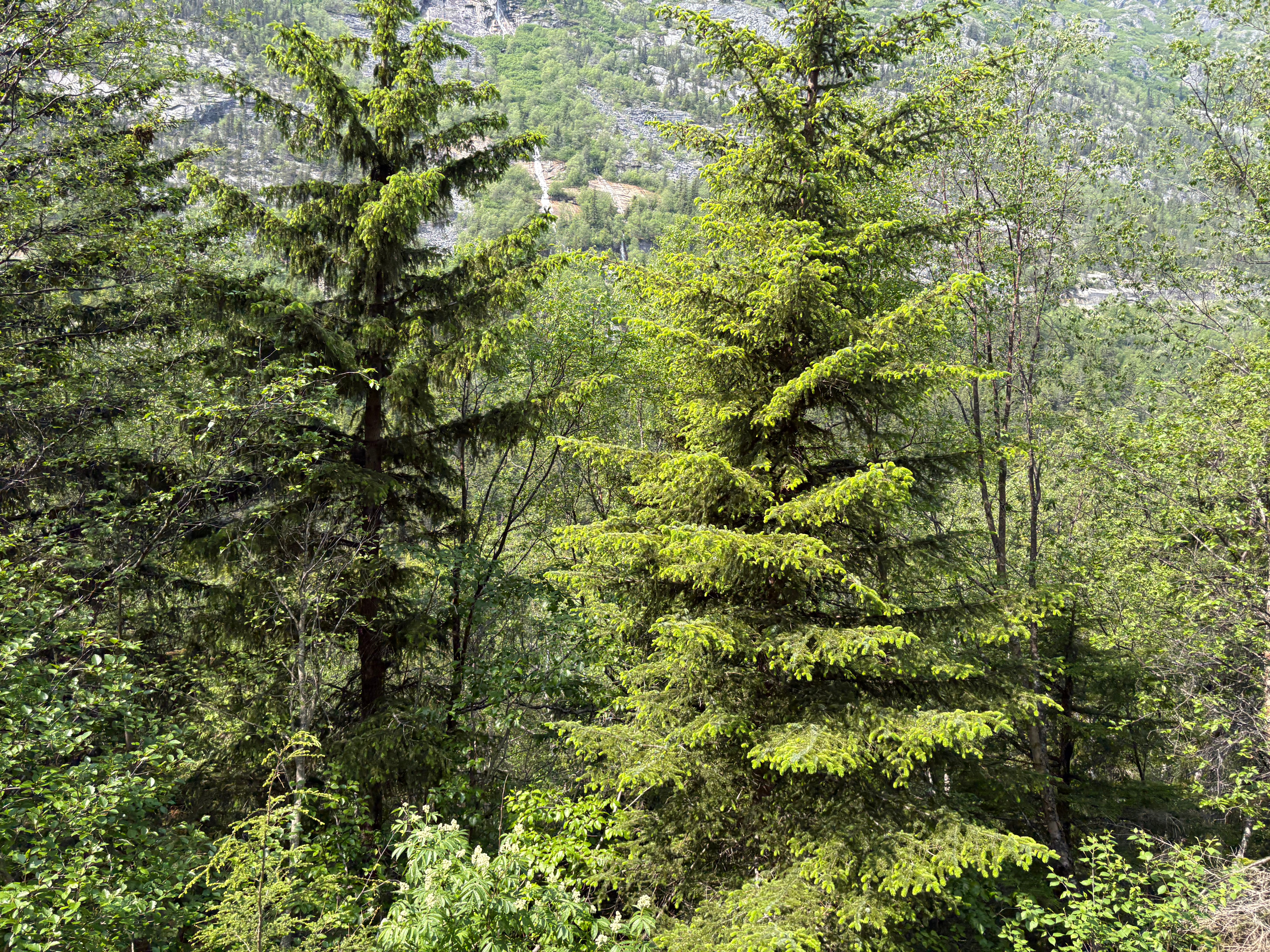 Skunk cabbage grows thick in the gullies and fruiting canes along the edges where there is more light;  food for humans and bears.  High on the slopes the Red and Yellow Cedar (Thuja plicata and Cupressus nootkaensis) give way to the Mountain Hemlock (Tsuga mertensiana) and the spruce (Picea sitchensis) rules them all.  The meagre Lodgepole Pine (Pinus contorta) huddle together like poor relations, upright and defiant in their low state.