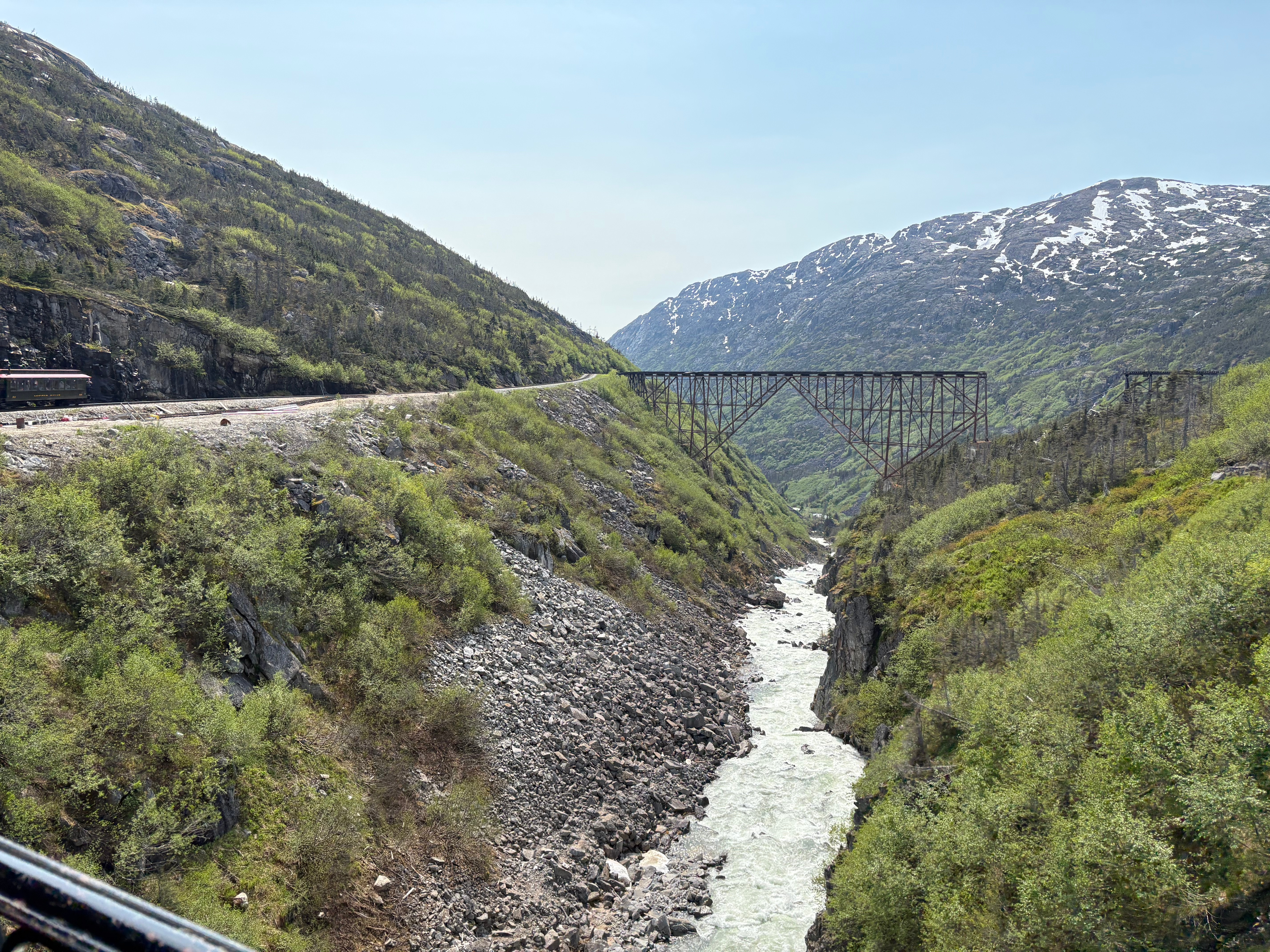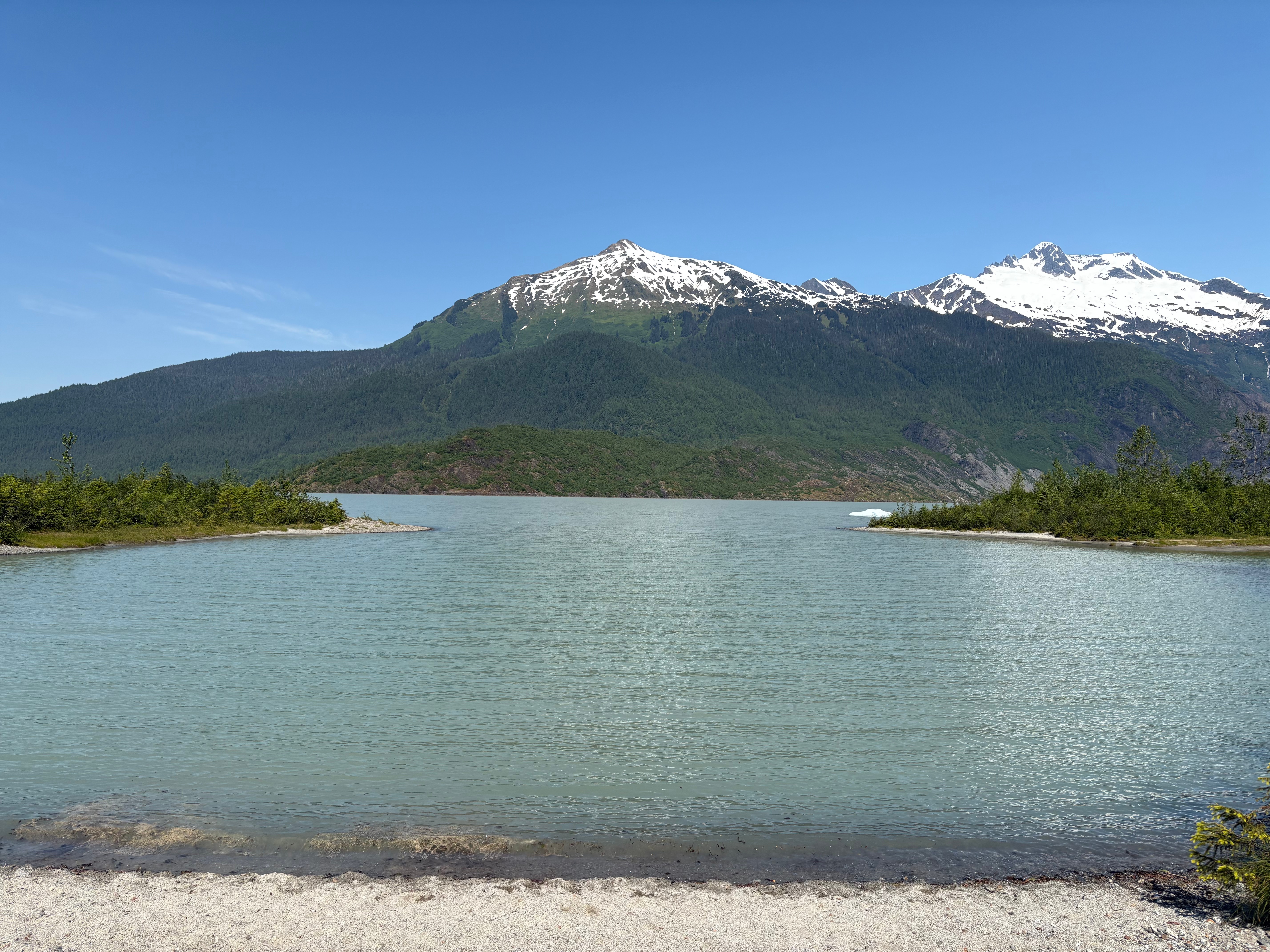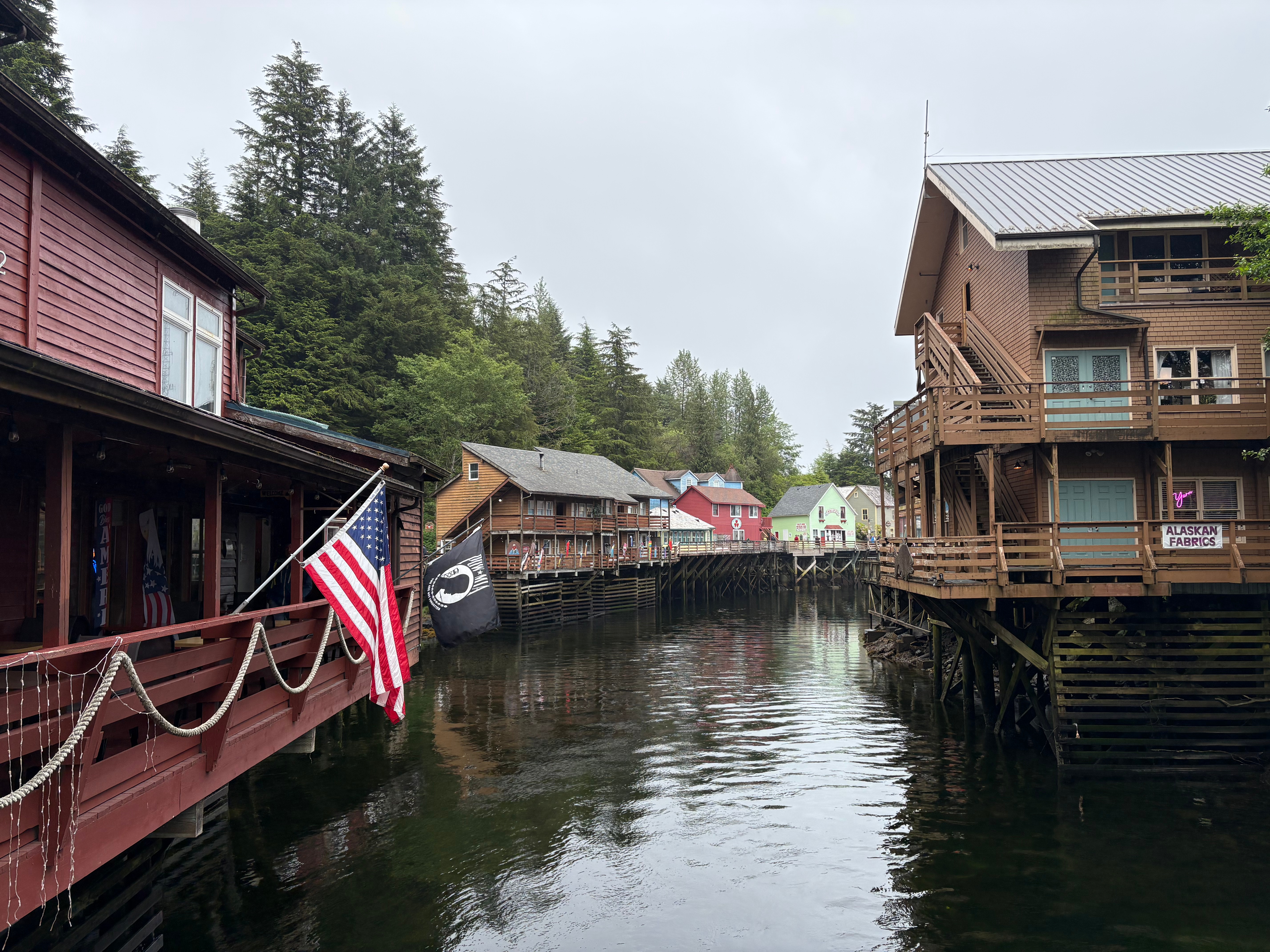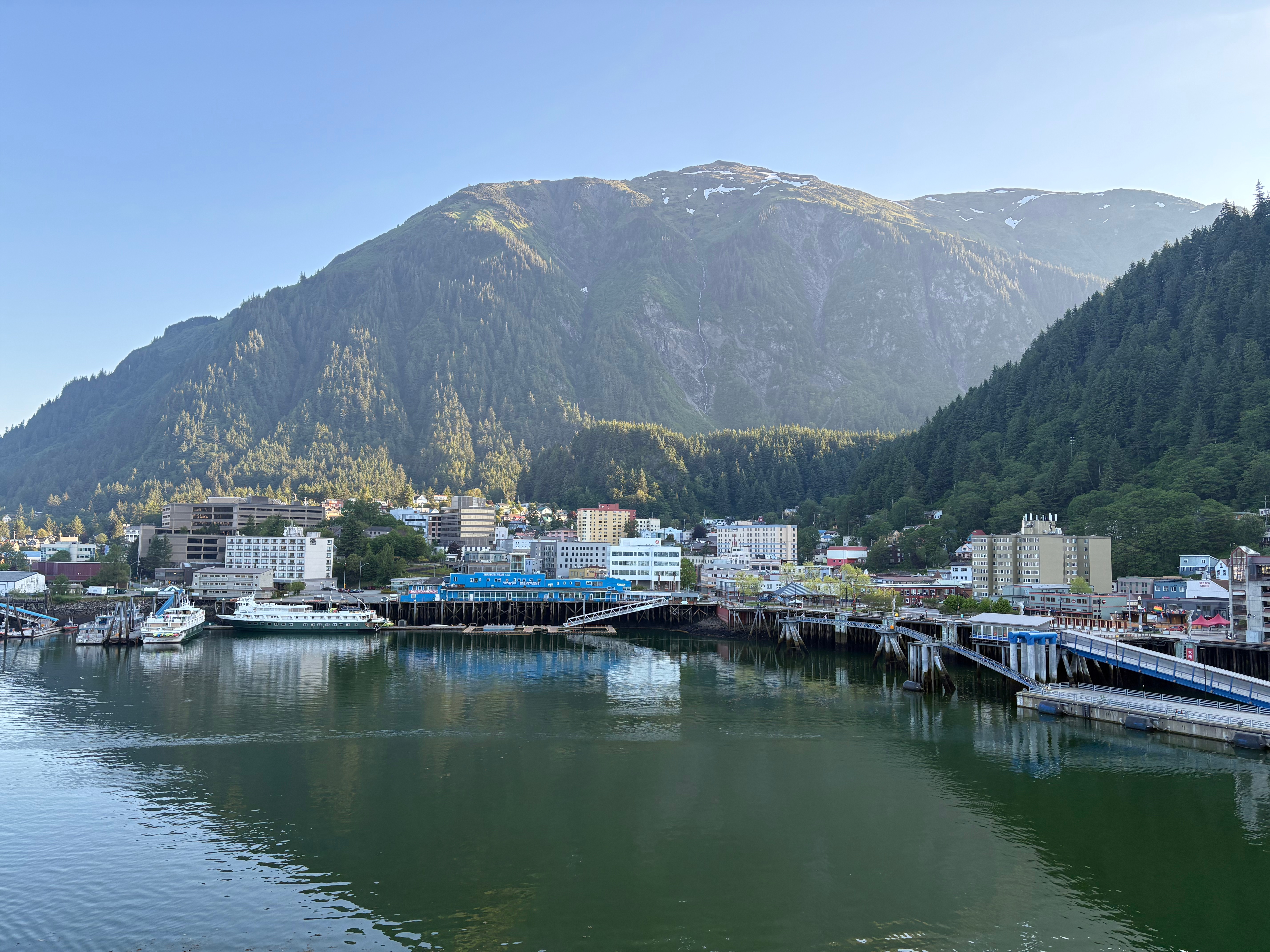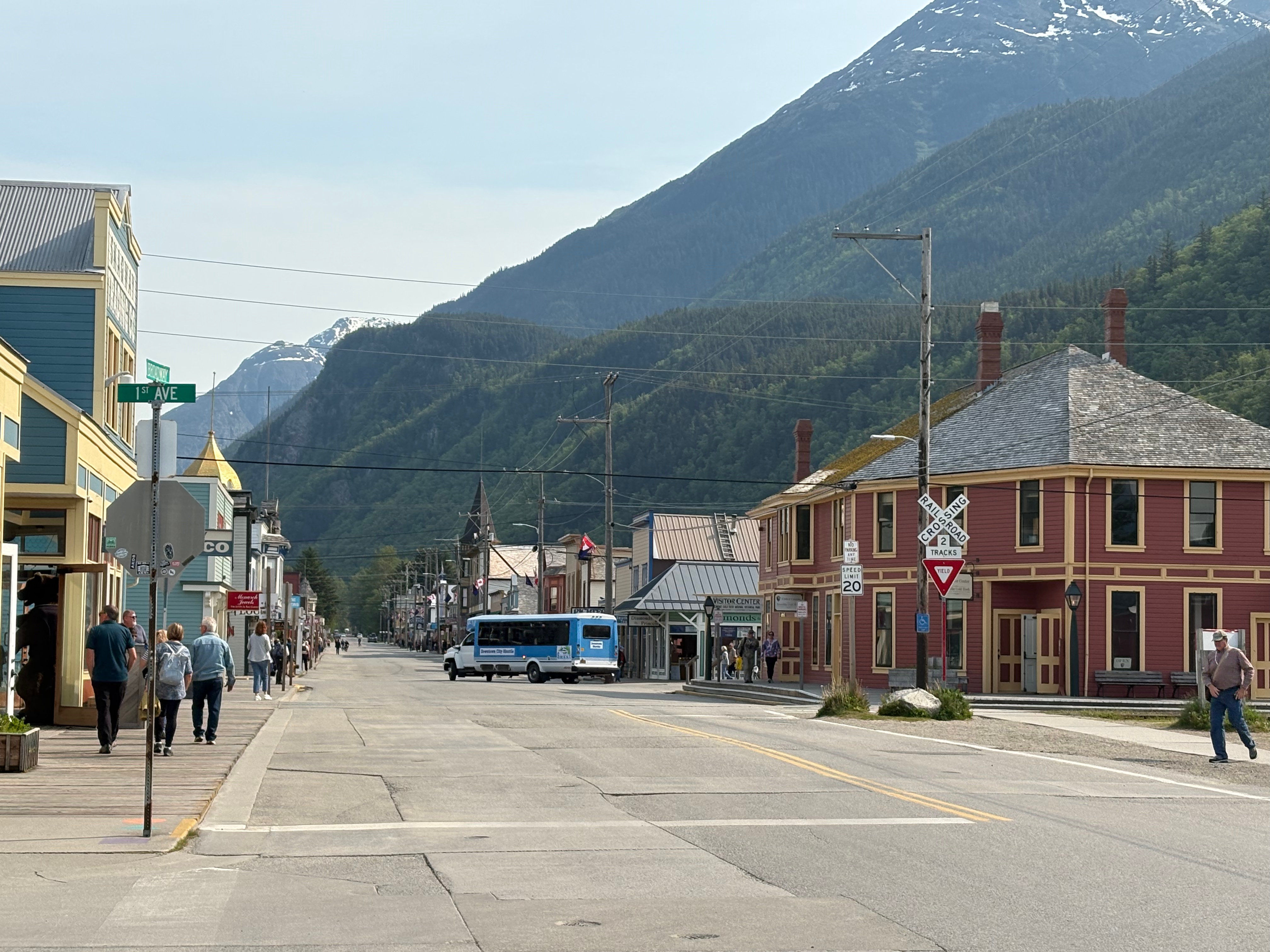 In the little coastal tourist towns of Sitka and Skagway and Ketchikan it rains a lot in spring and summer and autumn (fall) but temperatures are milder than the interior thanks to the ocean and the great forest.  Winters can be snowy but mostly on the mountains all around, that stick up like cake frosting.
