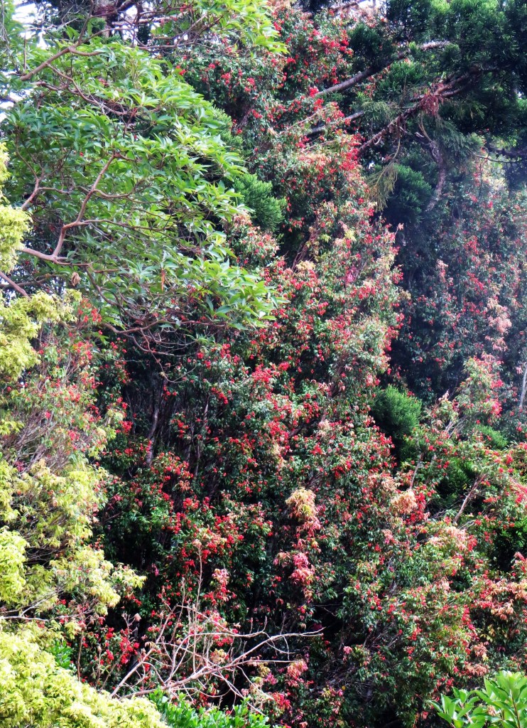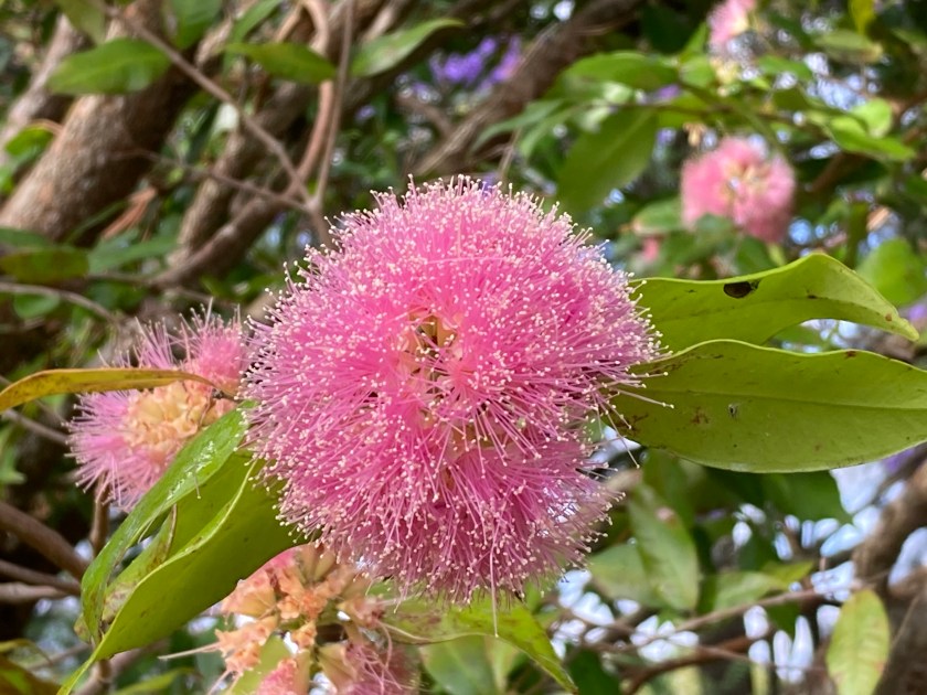 The flowers are spectacular too; big and pinkish red pompoms that, like the new growth, hang down from the branches.