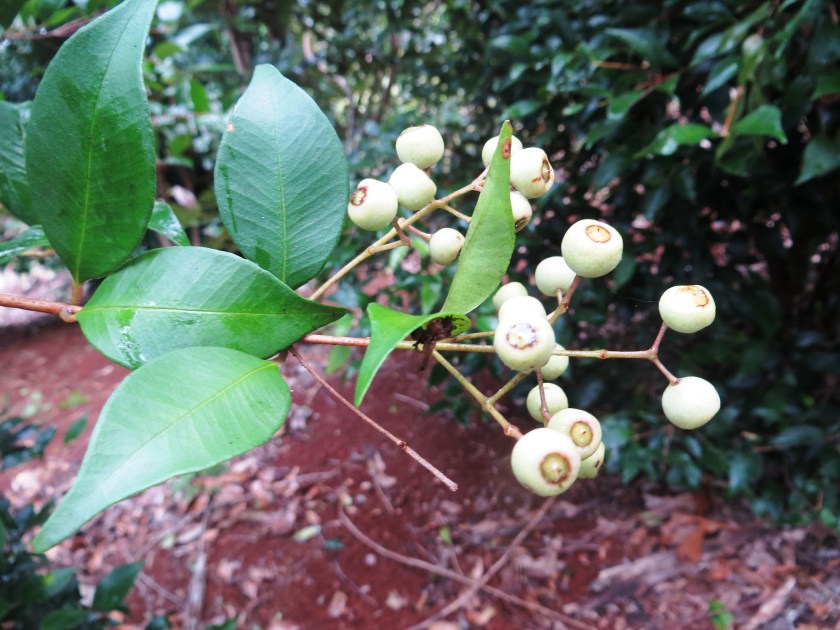 I don’t know why it is commonly known as “Rose Apple” because the fruits are white with a pale green tinge and look nothing like apples, though they are large for a Lillypilly.