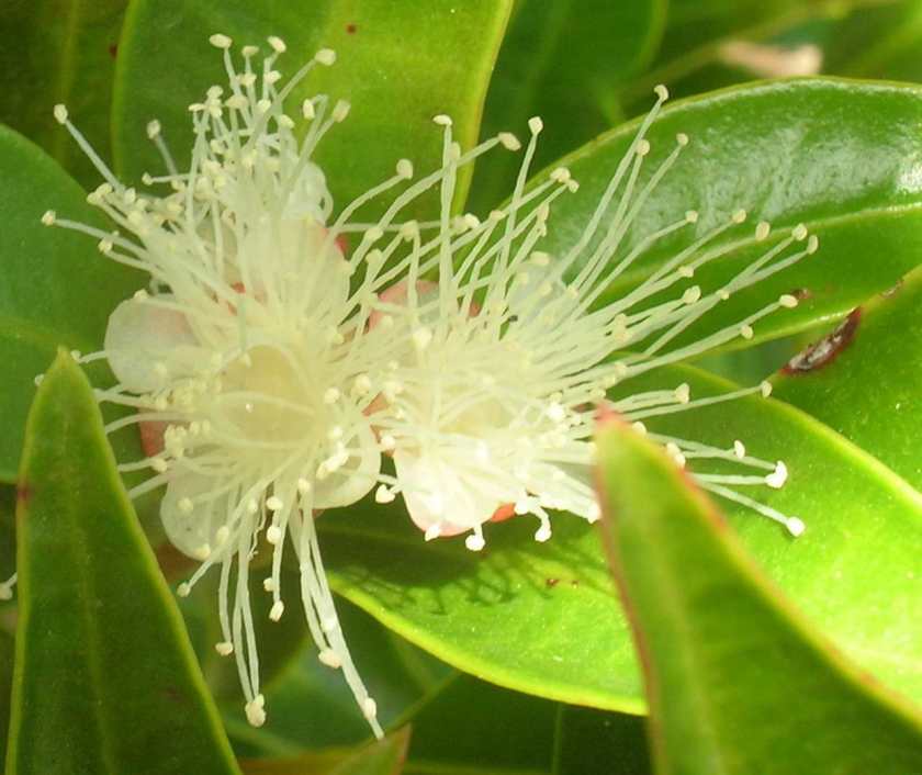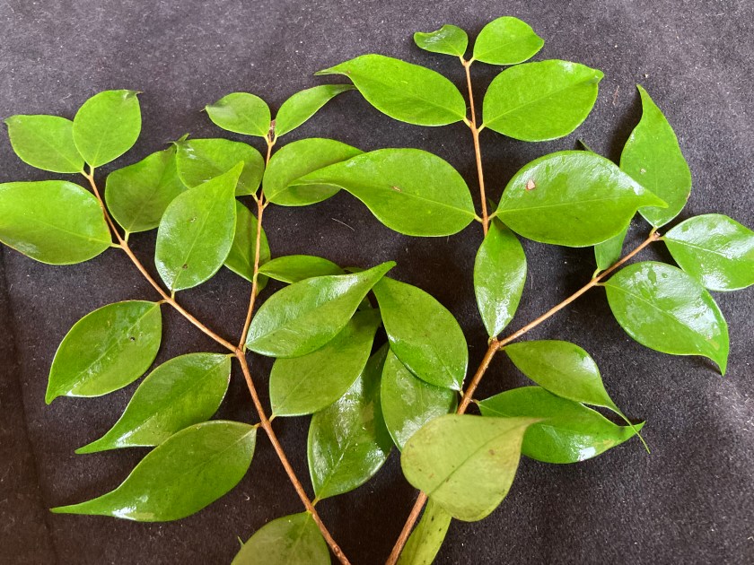 S. smithii has three common forms, “normal” with the usual lanceolate to obovate Syzigium leaves up to 16cm long, narrow-leaved (about half that length and linear to a fine point) and small-leaved (small, sometimes almost rounded leaves with blunter points). Oil dots and lateral veins are visible. Flowers are small and white, fruits are purplish pink and edible but not as palatable as, say, Riberry fruits.