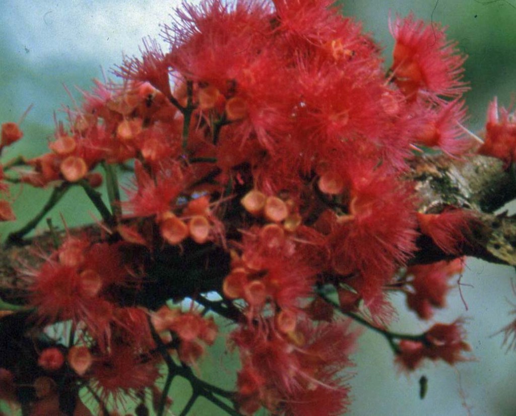 The trunk of this large tree can be brown to grey and features distinctive soft tissue-like scales if you look closely. Leaves are typically “Lillypilly”; simple, opposite, obovate to oblong-elliptical with a small, blunt point; lots of oil dots (seen through a lens) and parallel veins. Plus a fairly obvious intramarginal vein. Fluffy flowers are a gorgeous watermelon red, cauliferous (born along the branches) in clusters. Fruit is edible but boring.