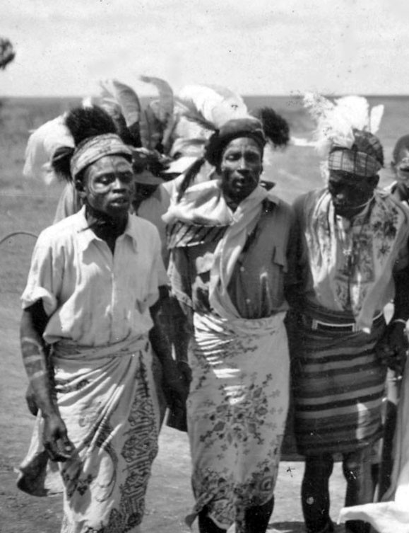 A witchdoctor (centre) and his two apprentices, circa 1958